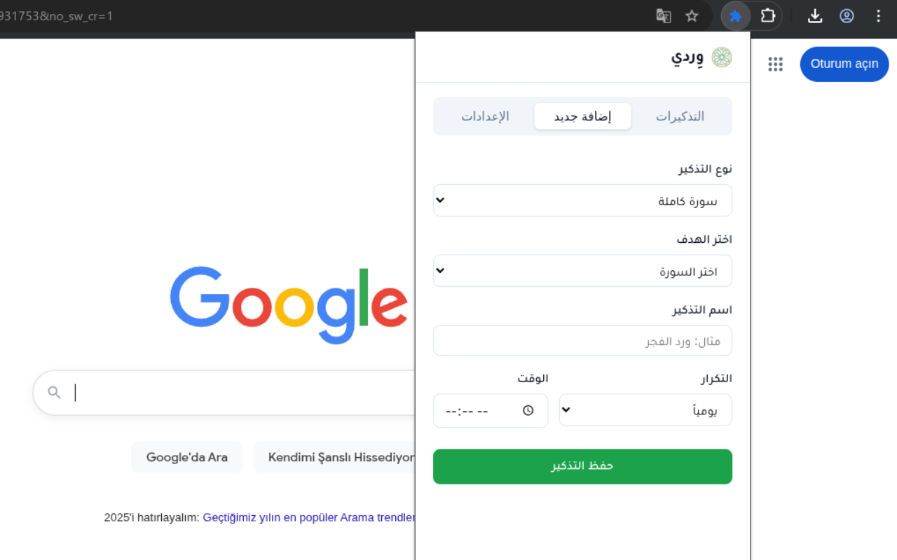 أحببت أن أجرّب قدرة الذكاء الاصطناعيّ على تحويل بعض الأفكار والمفاهيم إلى إضافات للمتصفح بالاعتماد على خبرتي في تطوير الويب، لذا عملت في الفترة السابقة على إضافة متصفّح بسيطة لغوغل كروم تسمح لك بتفعيل تذكيرات للورد القرآنيّ اليوميّ، وتسمح لك أيضاً بضبط التذكيرات الخاصّة بك.