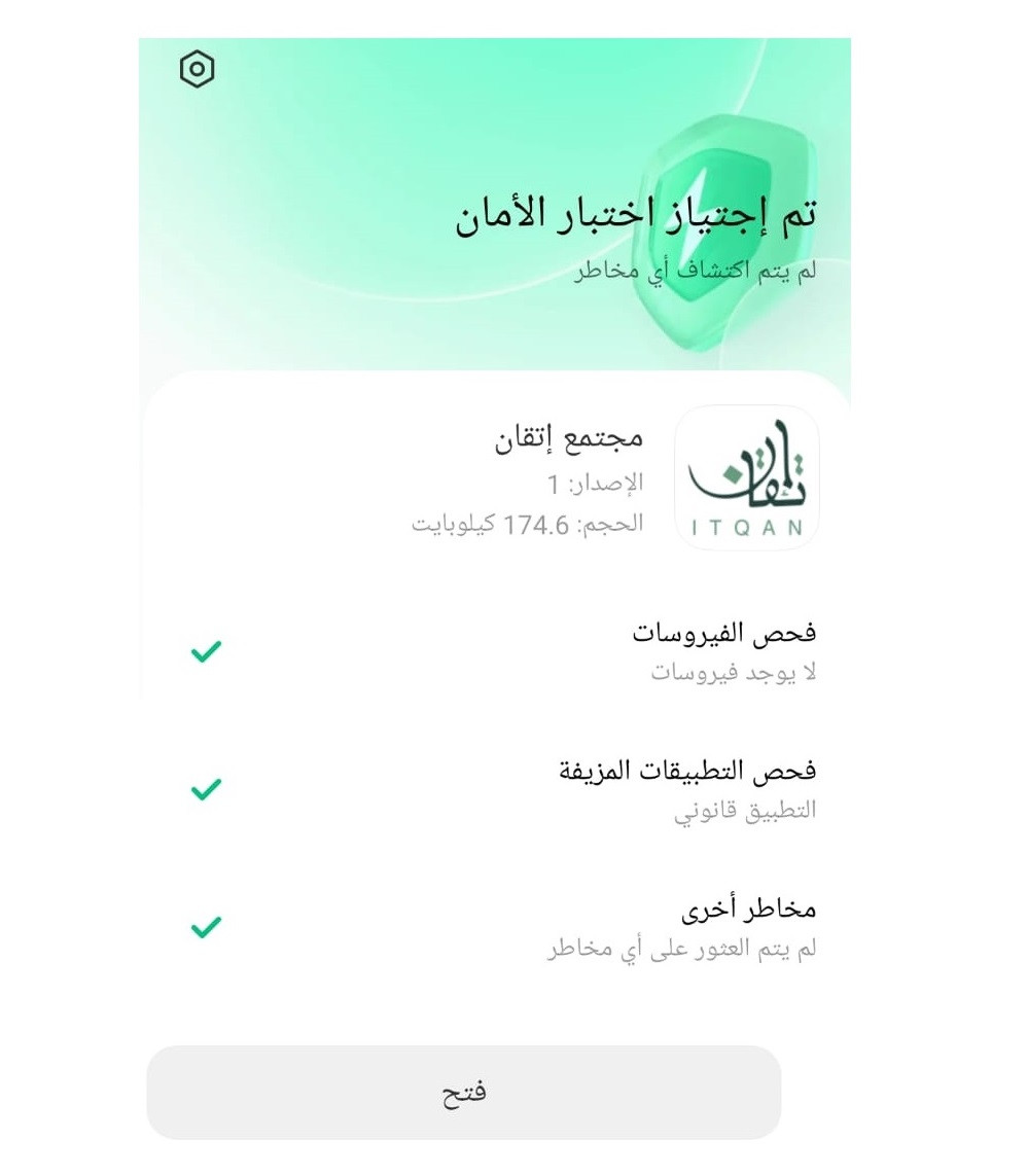 بعد انتهاء التثبيت وعرض شاشة تفيد بأن التطبيق آمن، يمكنك النقر على زر فتح لاستعراض المجتمع