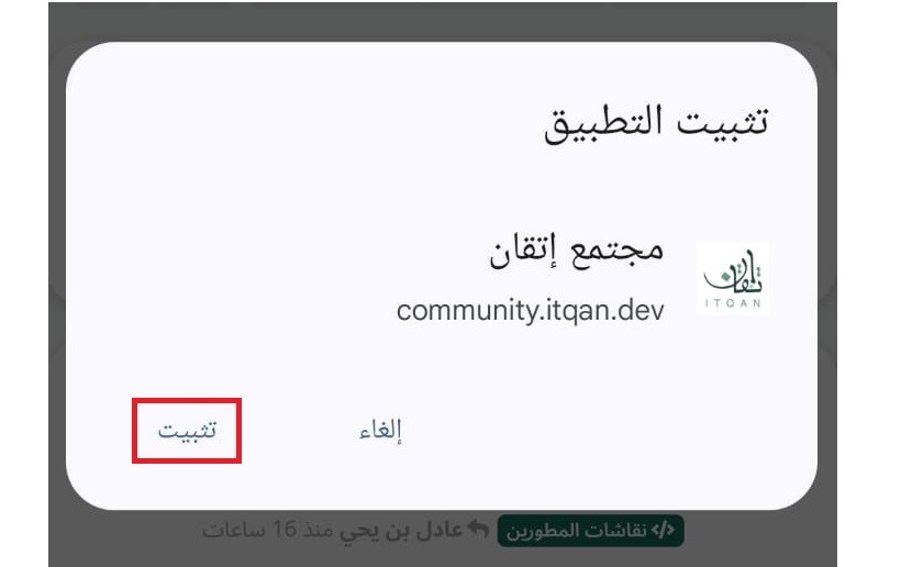 سيظهر لك إشعار في الأسفل يقترح تثبيت مجتمع إتقان كتطبيق، اضغط على زر تثبيت كما في الصورة التالية: